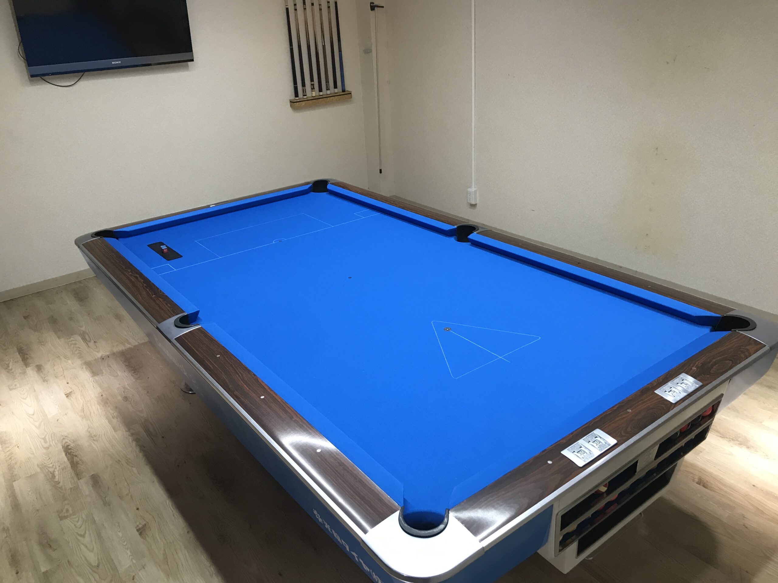 ラシャは、国内はグリーンが多いのですが、海外の試合動画などをみていると、最近はトーナメントブルーがよく使われているようでしたので、それに合わせました。